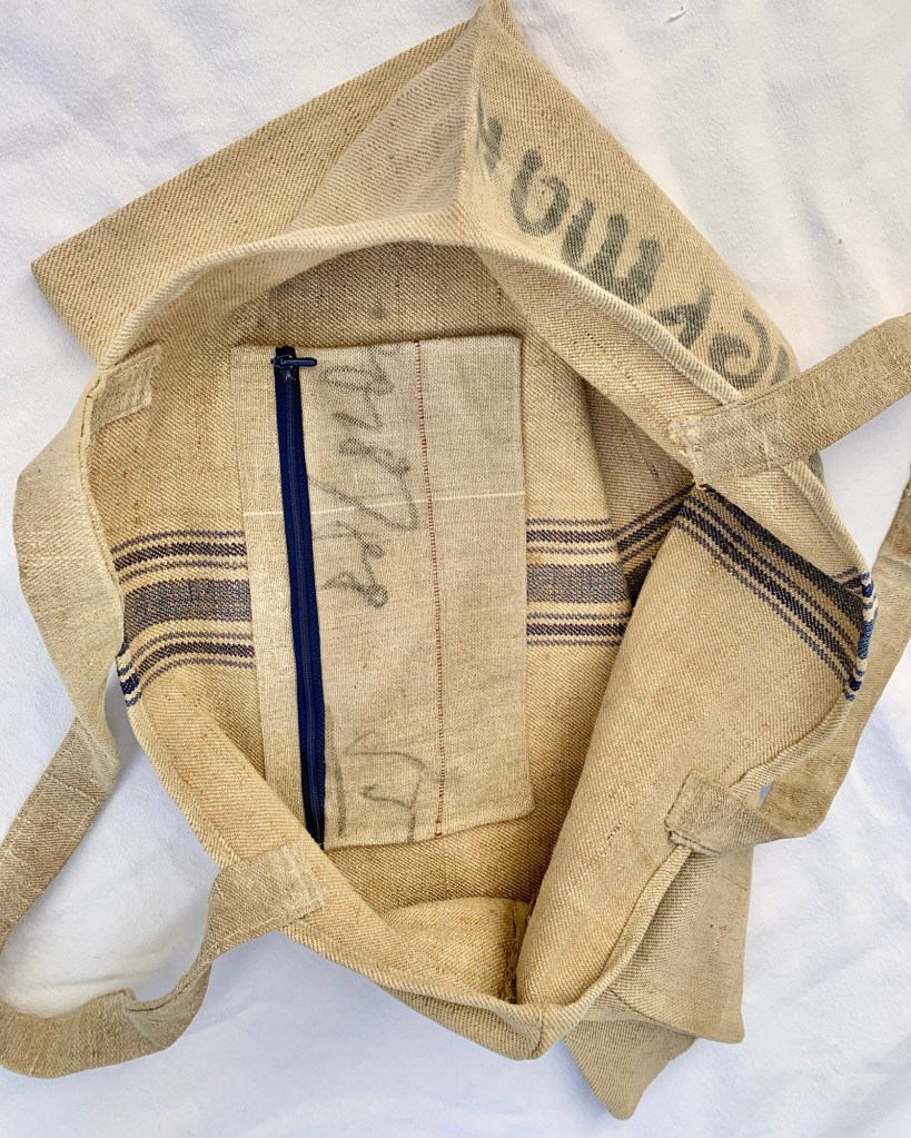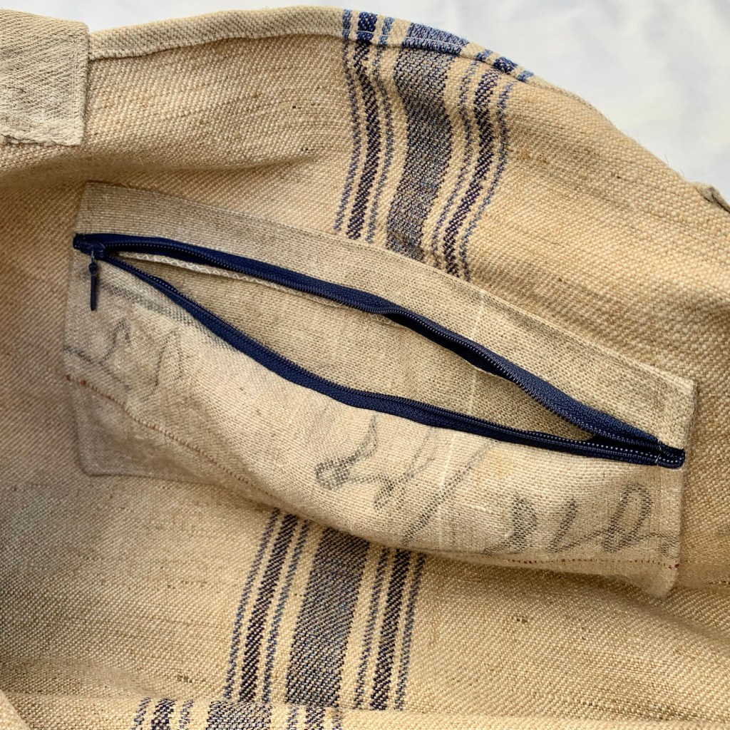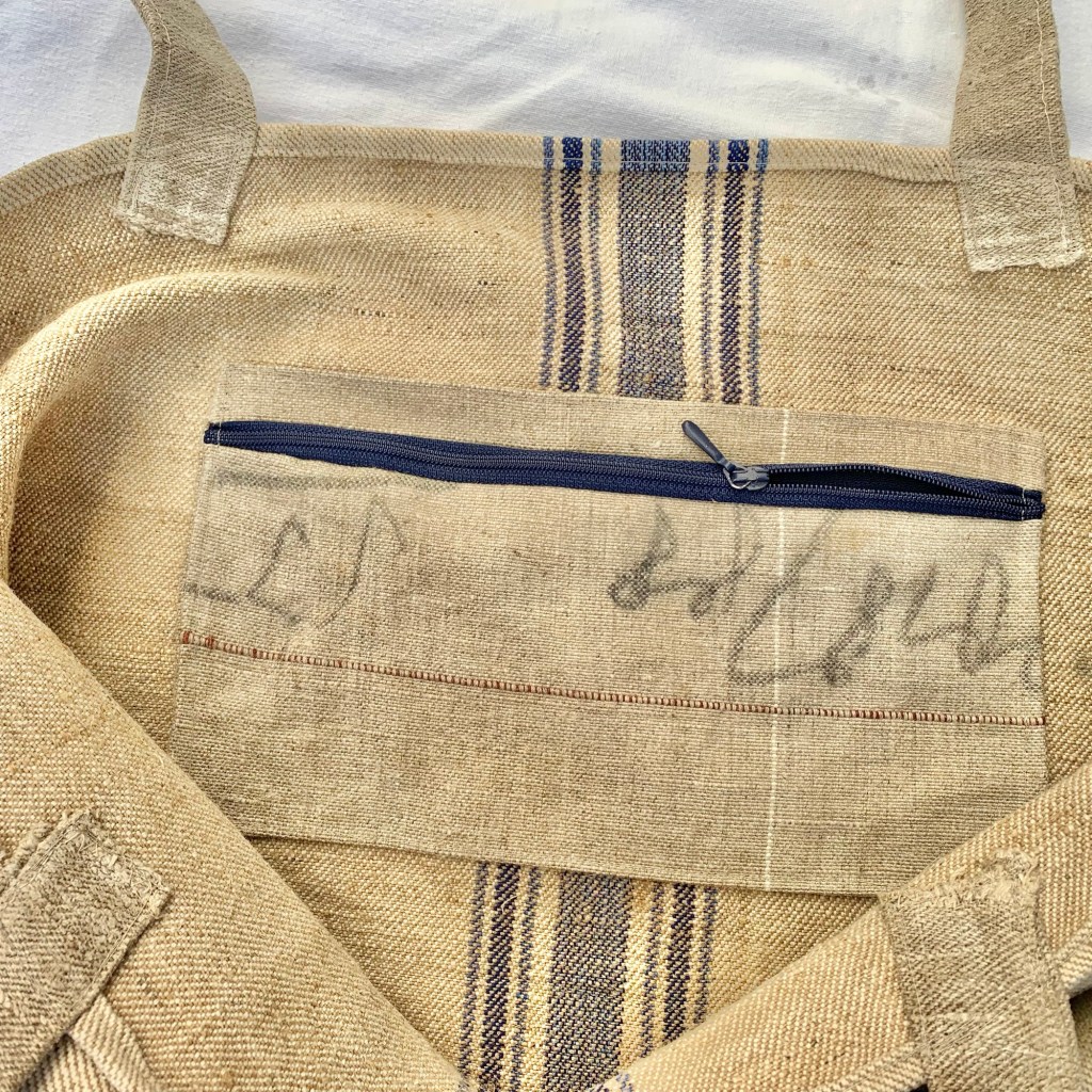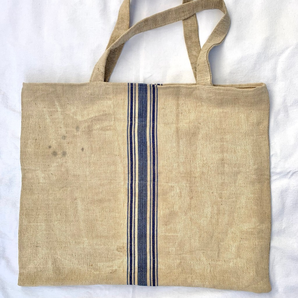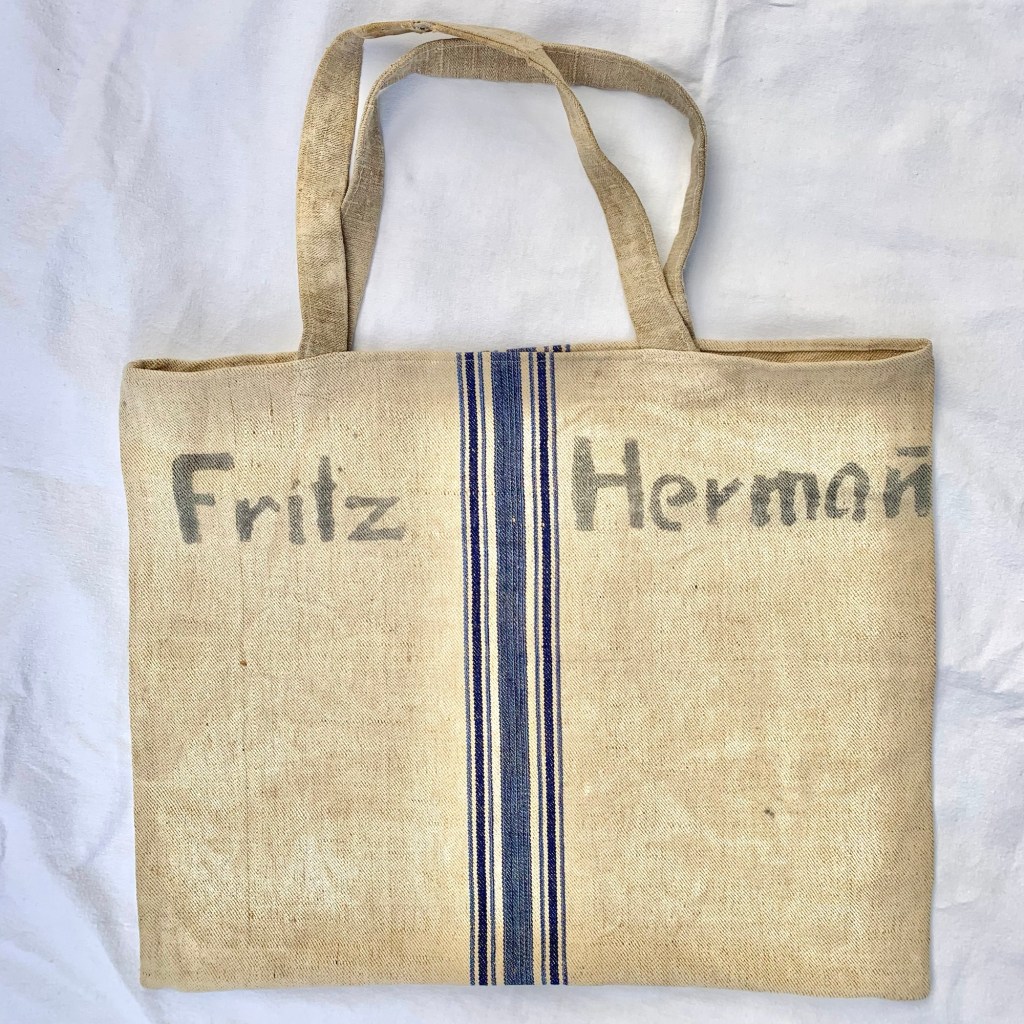 Schulter-Tasche aus Original-Getreidesack aus blickdichtem, stabilem und dennoch weichem Leinen, ca. 60 Jahre alt. Je öfter Leinen gewaschen und gebügelt wird, desto weicher wird es, diese Tasche fühlt sich daher so geschmeidig an. Ideal für Einkauf, Markt oder ins Freibad, für Strand, Sport und Freizeit, stabil, robust, kann auch mal feuchte Badetücher aushalten; H: 45cm, B: 54cm, Riemenlänge: 57cm