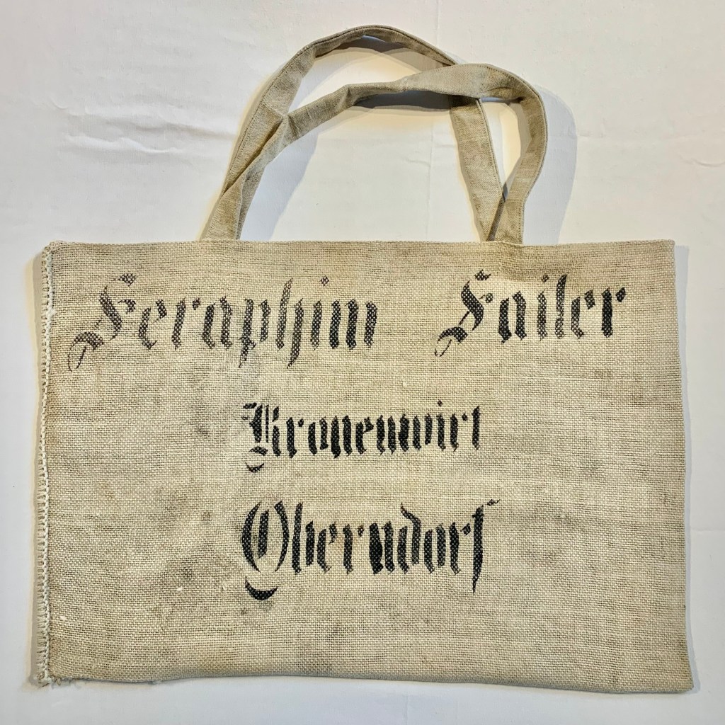 Große Umhängetasche, Schulter-Tasche, umweltfreundliches Upcycling aus Original-Getreidesack (etwa 70 Jahre alt mit Gebrauchsspuren) aus robuster Jute, Aufdruck: Seraphim Sailer, Kronenwirt, Oberndorf; mit kleiner Innentasche (mit Reißverschluss) für Schlüssel, Telefon etc., originell aus altem, beschrifteten Stoffrest gefertigt, Schulterriemen aus weichem Leinenstoff eines antiken Getreidesacks hergestellt; SERAPHIM hat ein sorgfältig eingesetztes Innenfutter aus Leinen (gefertigt aus Einlagestoff aus der Konfektionsfertigung), so dass sich die Innenseite angenehm glatt und weich anfühlt; SERAPHIM ist ein absolutes Unikat, ideal für iEinkauf, Markt, Sport, Freizeit, Strand oder ins Freibad, die Tasche hält auch mal ein feuchtes Handtuch aus.
