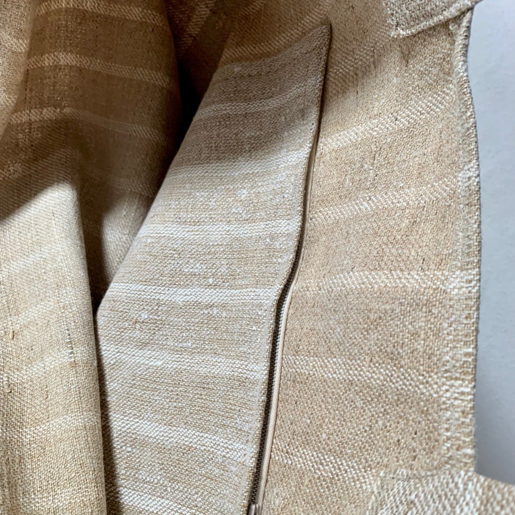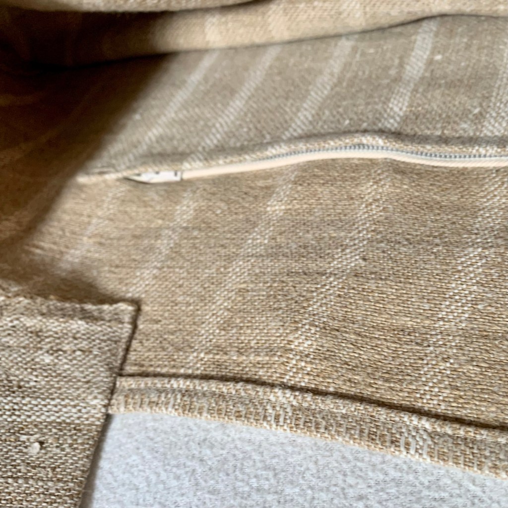 Umhängetasche, beige/creme gestreift, aus Original-Getreidesack (ca. 70 Jahre alt,reines Leinen), mit kleiner Innentasche (mit Reißverschluss); Upcycling; Unikat aus blickdichtem, stabilem und dennoch weichem Leinenstoff, für Einkauf, Markt oder ins Freibad, waschbar bis 90 Grad, H: 41cm, B: 53cm, Riemenlänge: 51cm