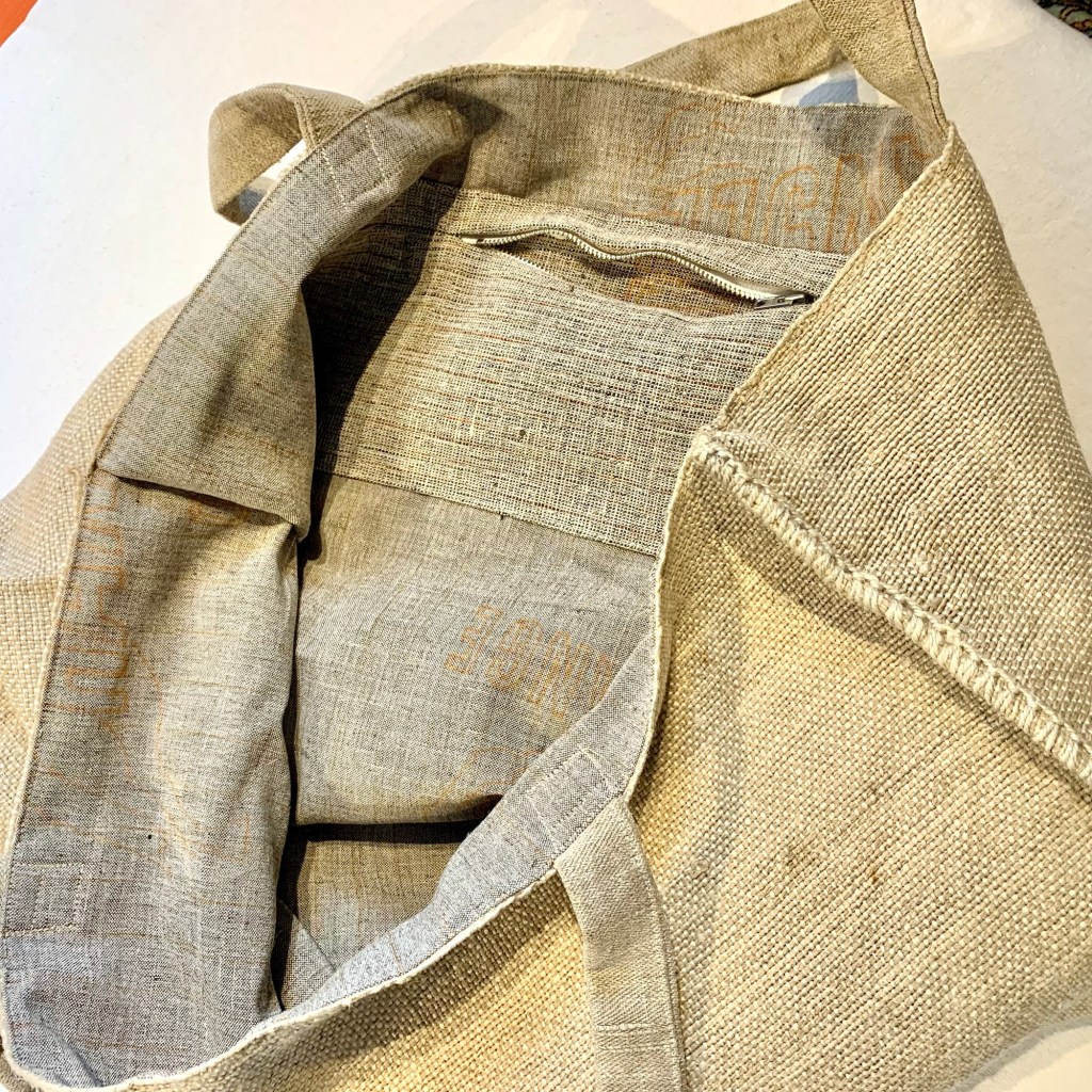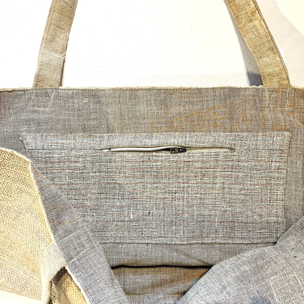 Große Umhängetasche, Schulter-Tasche, umweltfreundliches Upcycling aus Original-Getreidesack (etwa 70 Jahre alt mit Gebrauchsspuren) aus robuster Jute, Aufdruck oder Stempel: UK und 13; mit kleiner Innentasche (mit Reißverschluss) für Schlüssel, Telefon etc., Schulterriemen aus weichem Leinenstoff eines antiken Getreidesacks hergestellt; UK13 hat ein sorgfältig eingesetztes Innenfutter aus Leinen (gefertigt aus Einlagestoff aus der Konfektionsfertigung), so dass sich die Innenseite angenehm glatt und weich anfühlt, auch die Innentasche ist aus diesem Material. UK13 ist ein absolutes Unikat, ideal für Einkauf, Markt, Sport, Freizeit, Strand oder ins Freibad, die Tasche hält auch mal ein feuchtes Handtuch aus.